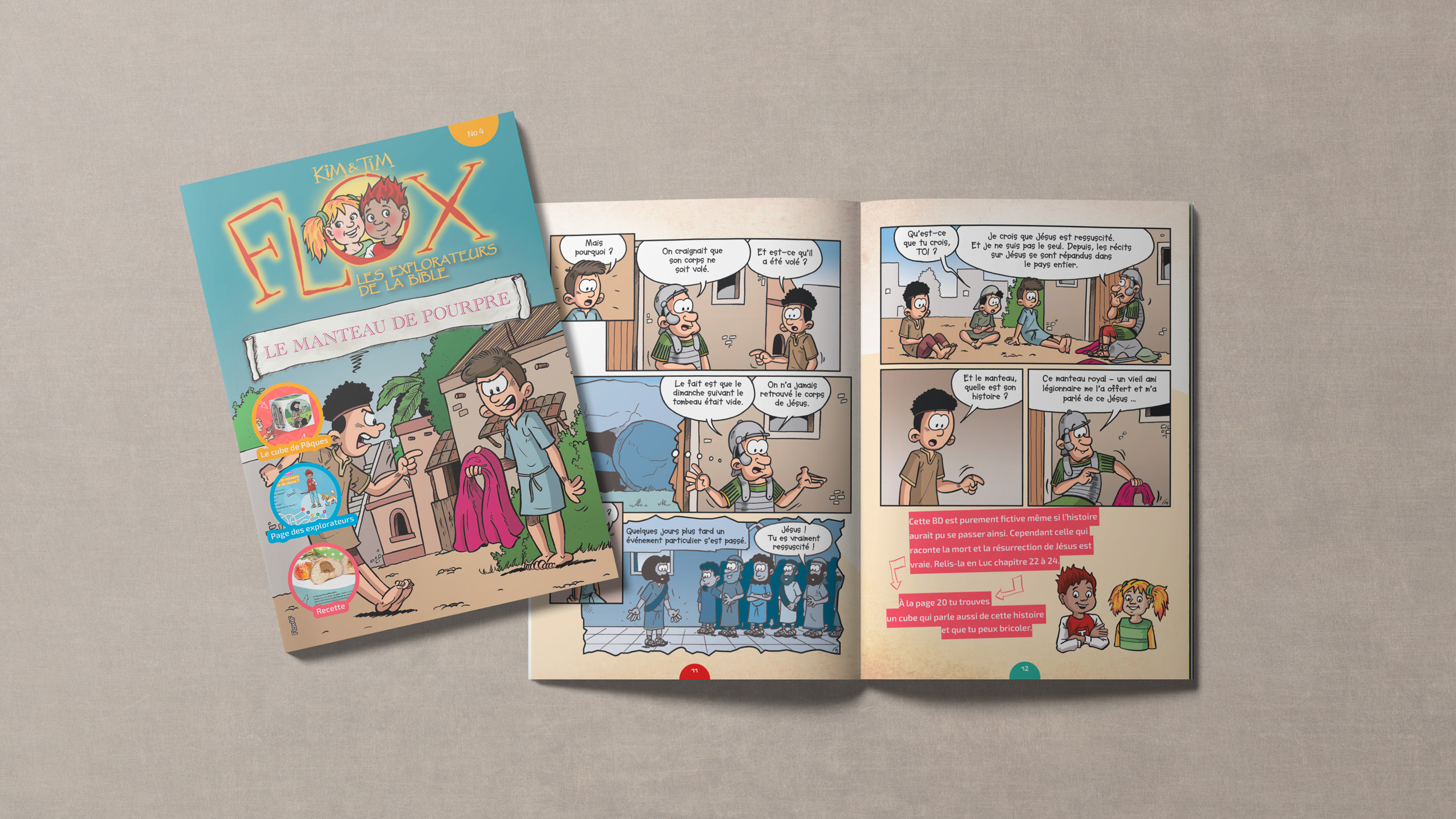 Le Flox 4 « Le manteau de pourpre » raconte l’histoire de la mort et de la résurrection de Jésus. Il permet de découvrir l’immensité de l’amour de Dieu pour nous et la fiabilité des récits bibliques. Idéal pour la période de Pâques ou de l’évangélisation. Flox-4 contient aussi des pages de découverte de la Bible, des jeux, des énigmes, une recette, une interview, un cube de Pâques à bricoler ainsi qu’une carte postale avec laquelle les enfants peuvent commander une Bible gratuite avec l’accord de leurs parents ou s’inscrire au cours biblique gratuit kids-team.